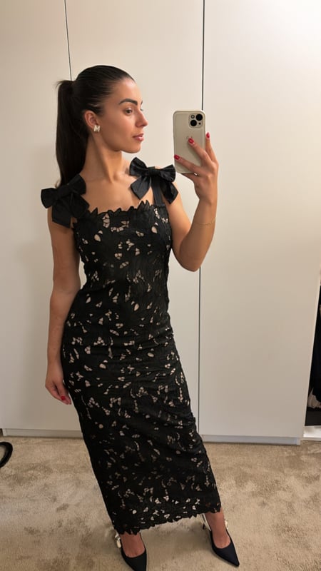 Designed with an elegant and sophisticated flair, theĀ Milena | Maxi Dress š¤ features exquisite floral lace detailing on a sleek black base, adorned with playful velvet bows on the shoulders. The fitted silhouette enhances your curves, while the intricate design and luxurious fabric make this dress perfect for formal events, evening galas, or any occasion where you want to leave a lasting impression.